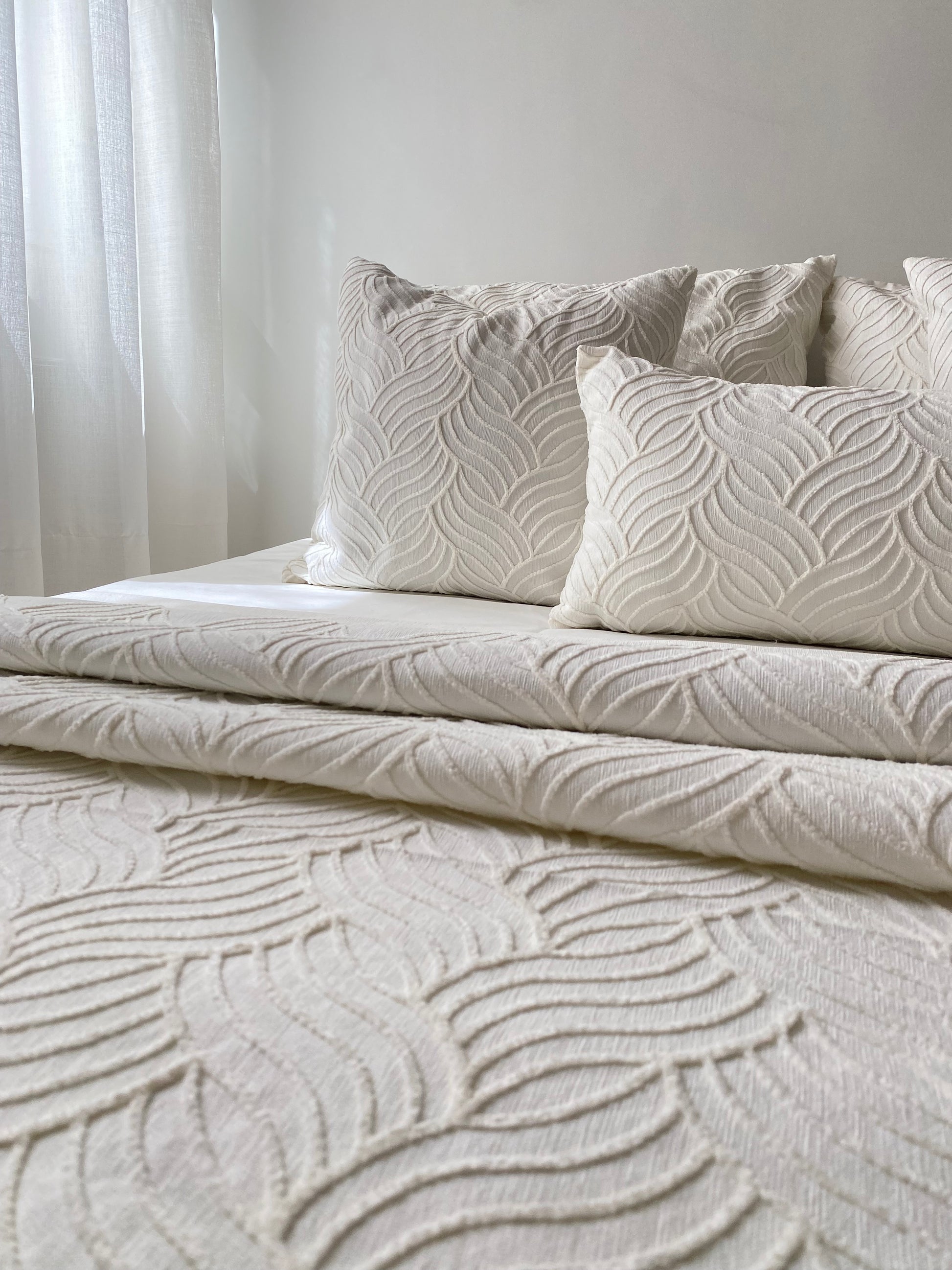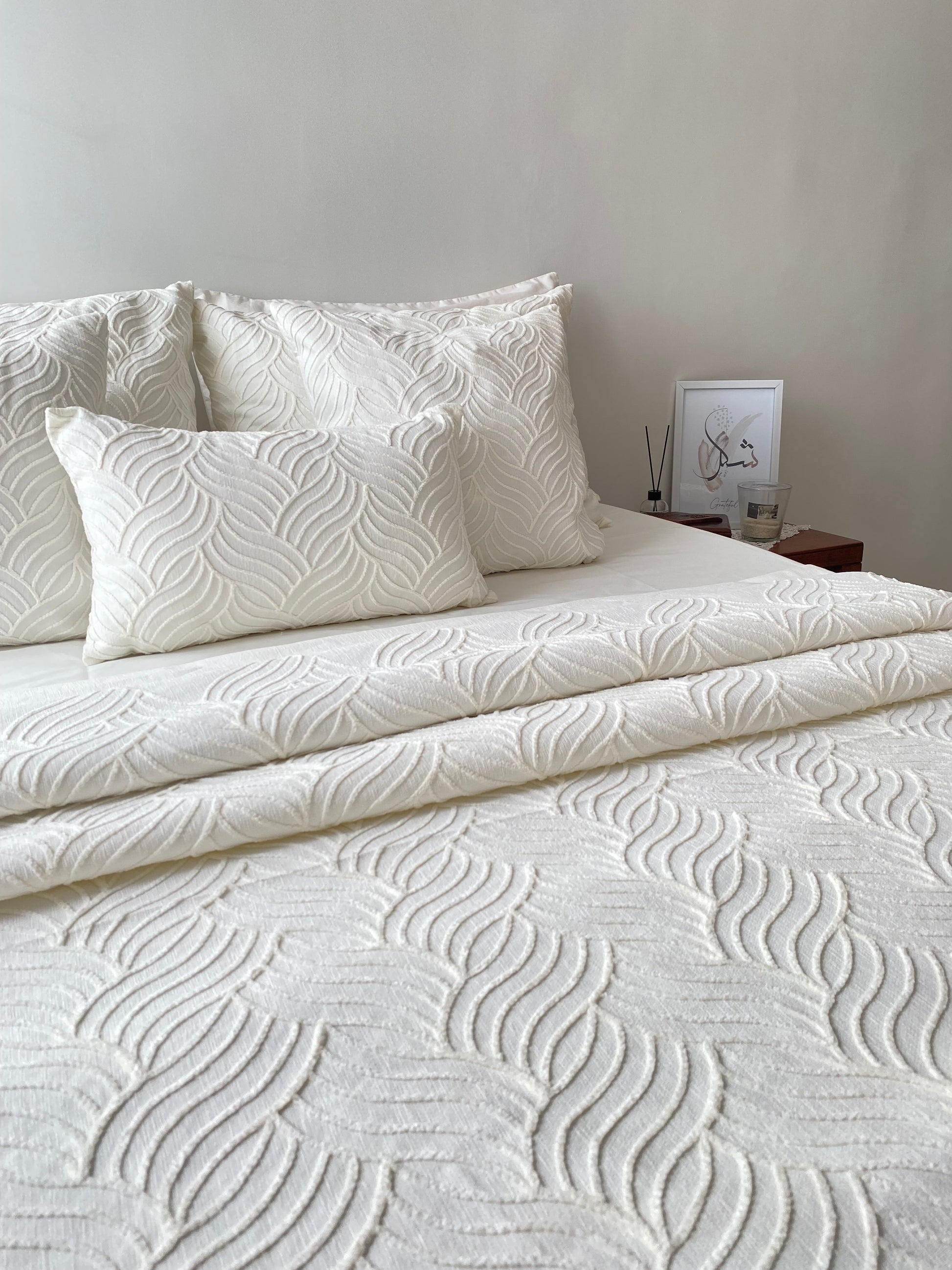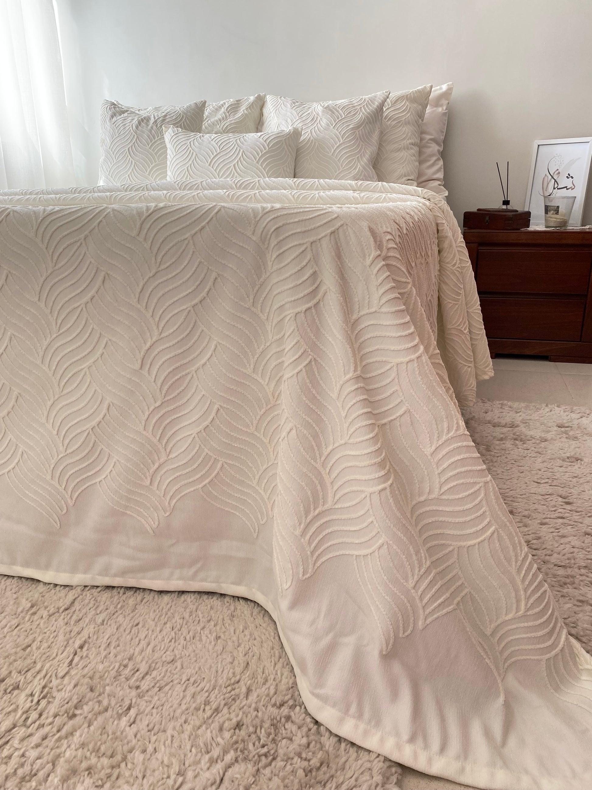 - Ensemble complet 9 pièces : couvre lit + housse de matelas + 4 taies + 3 jetées