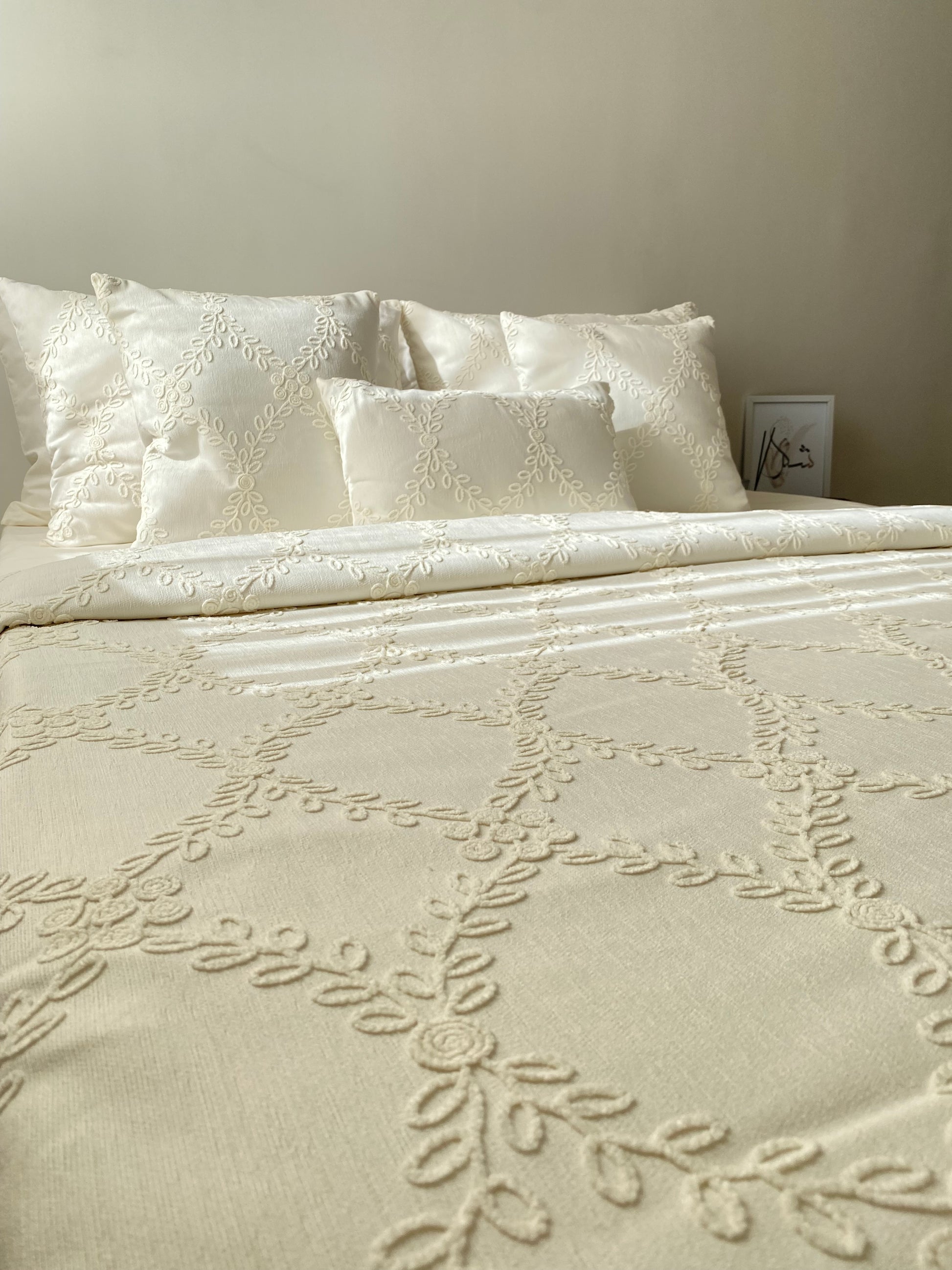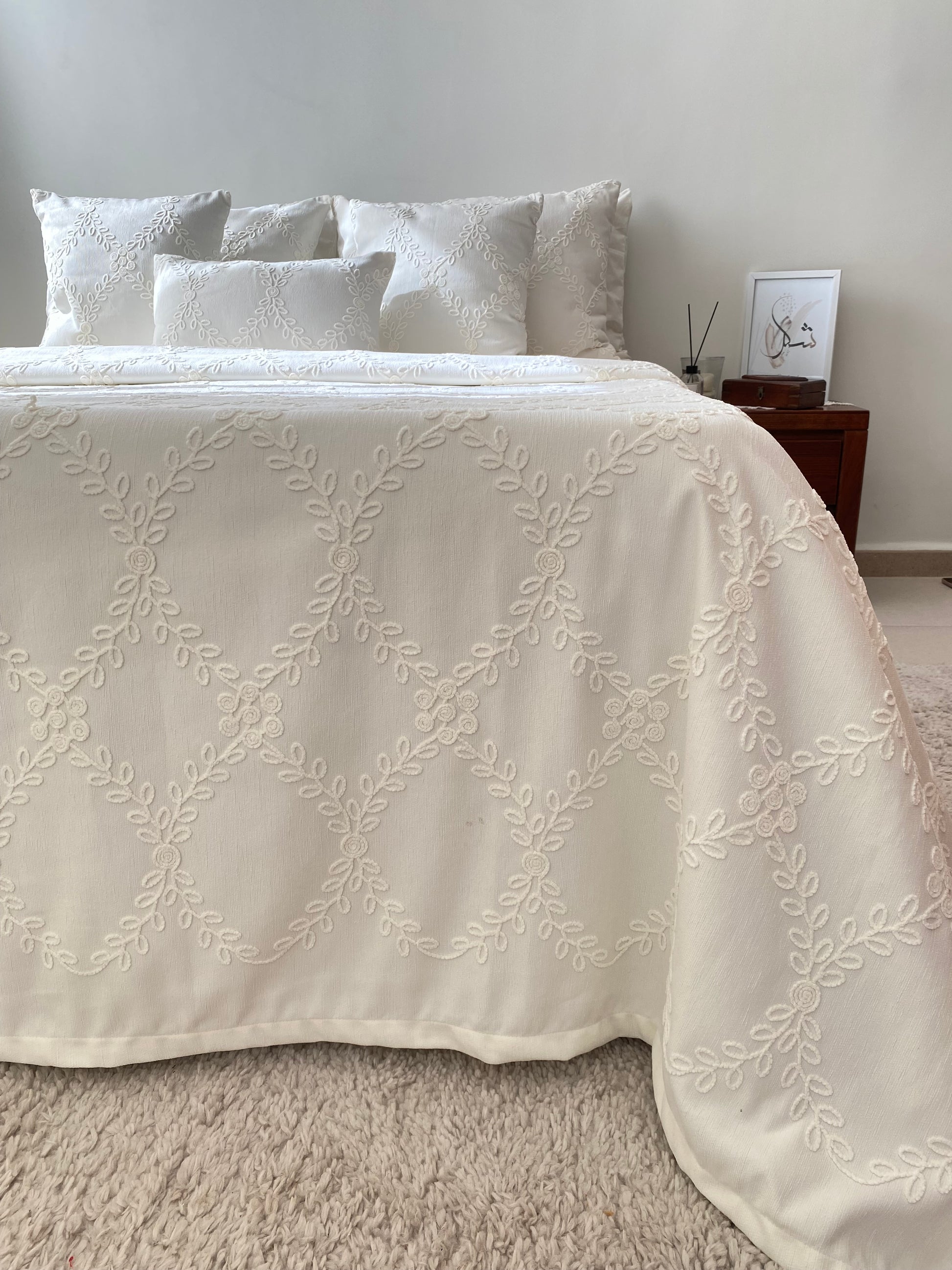 - Ensemble 6 pièces : couvre lit + 2 taies + 3 jetées