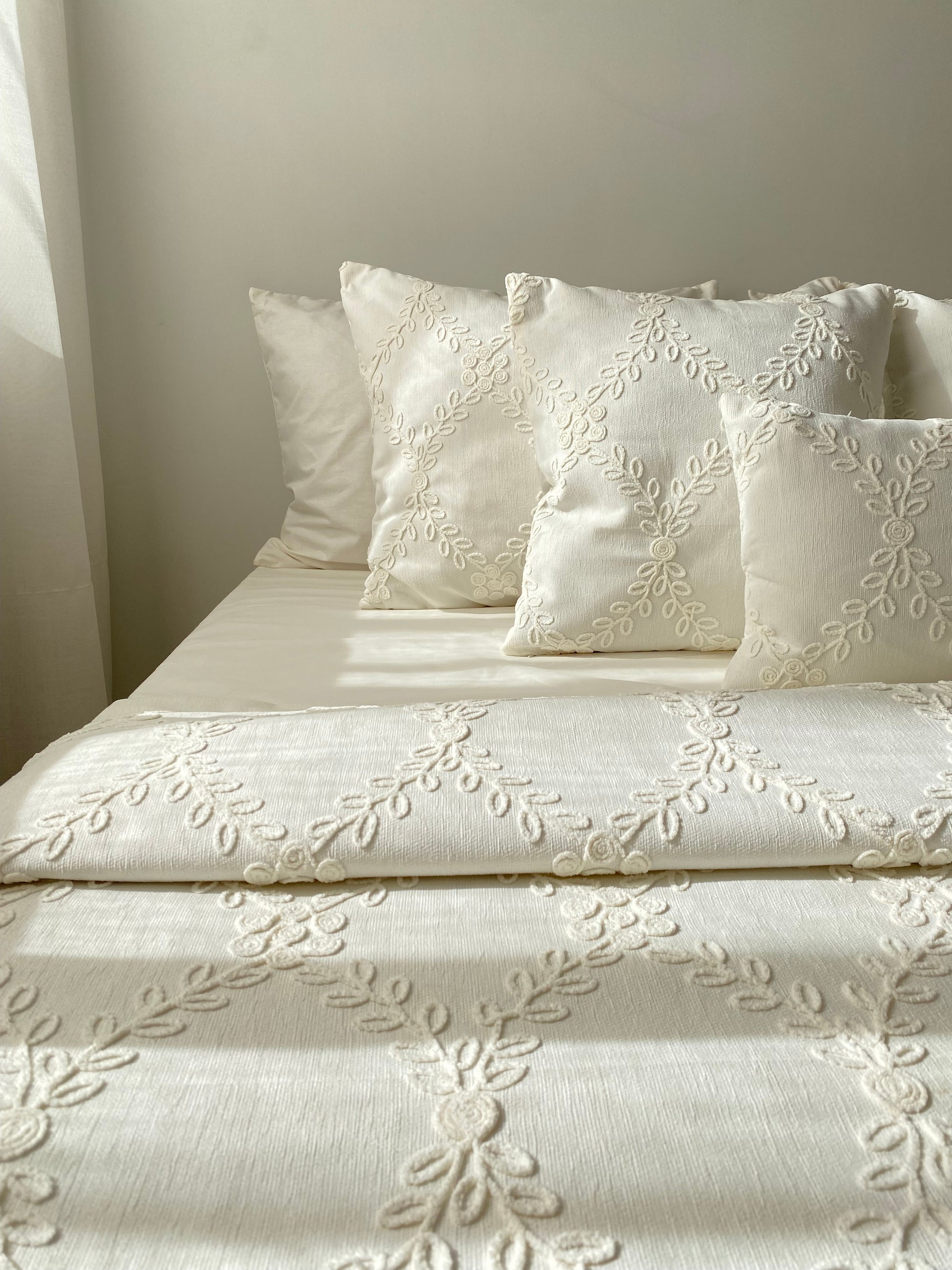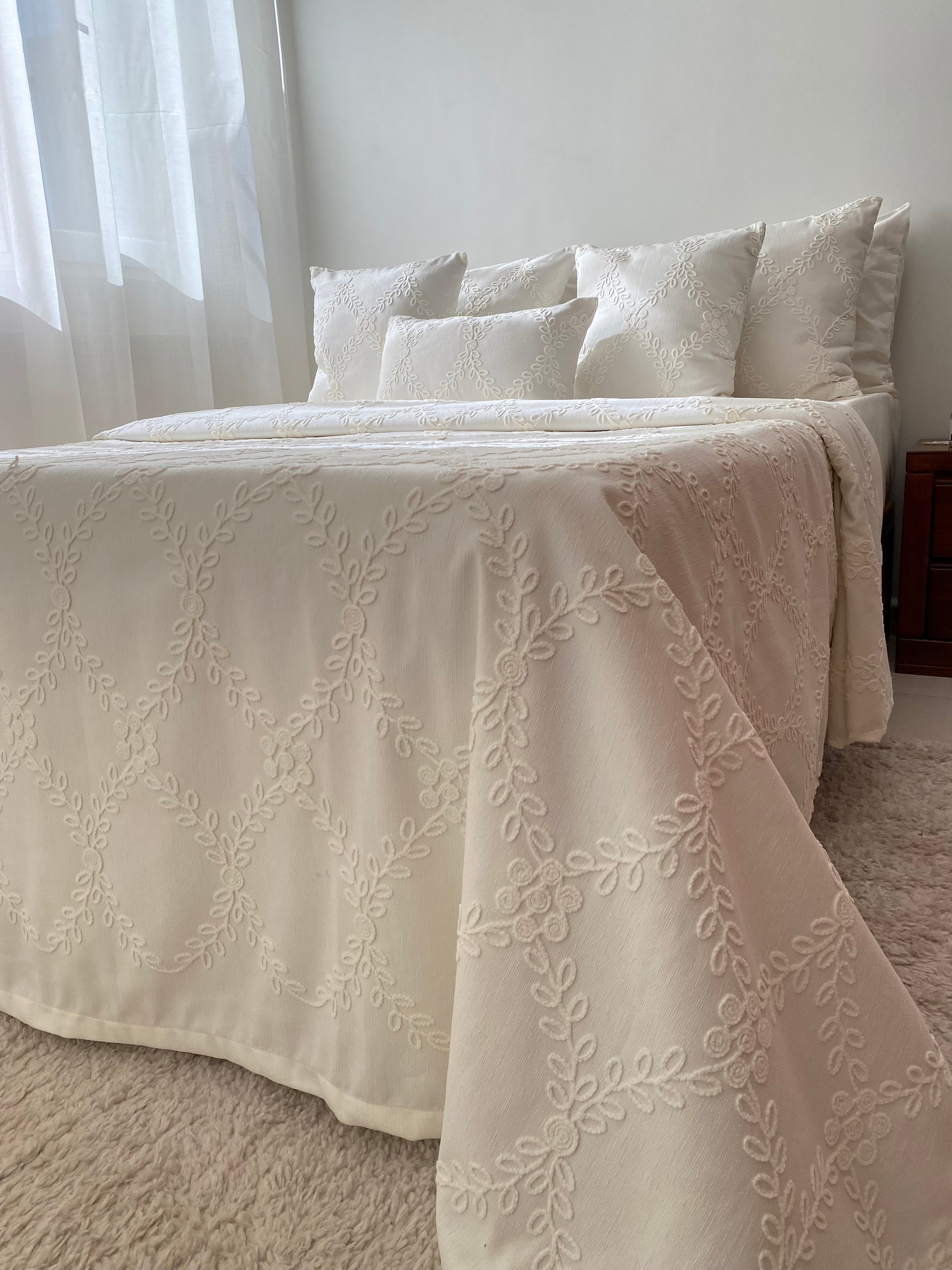 - Ensemble complet 9 pièces : couvre lit + housse de matelas + 4 taies + 3 jetées