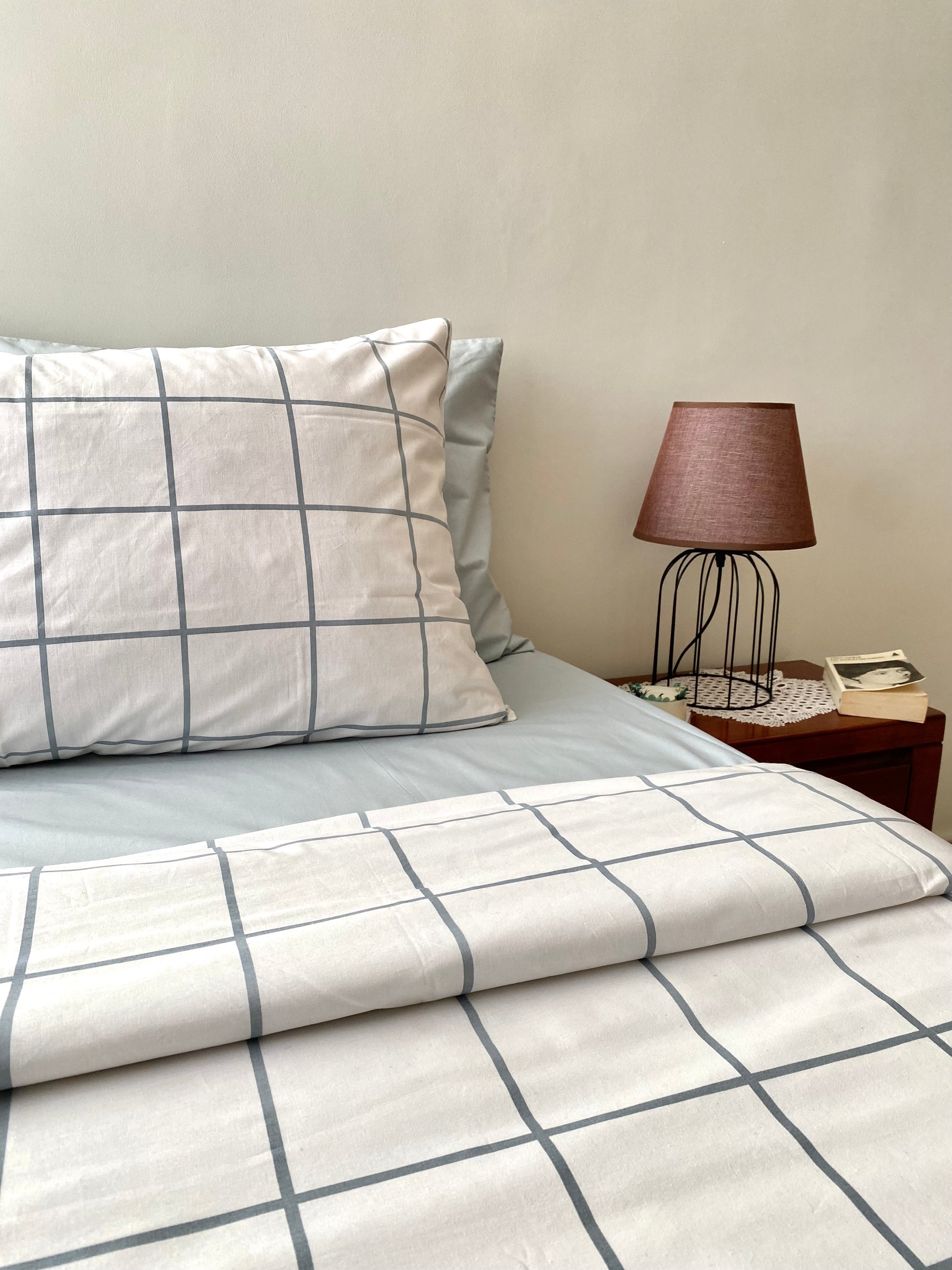 - Parure 6 pièces : drap ou housse de couette, housse de matelas et 4 taies